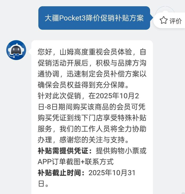 山姆表示积极与品牌方沟通协调,迅速制定会员补偿方案,针对这次促销,在2025年10月2日-8日期间购买大疆产品的会员,可以凭购买凭证,在10月31日前到线下门店办理补贴,目前已有网友晒出了领取的山姆660元优惠券。